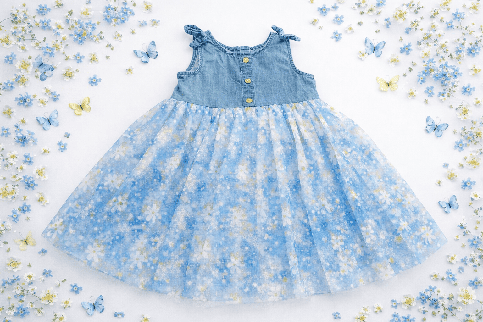 Vestido vaquero sin manga con tul de flores